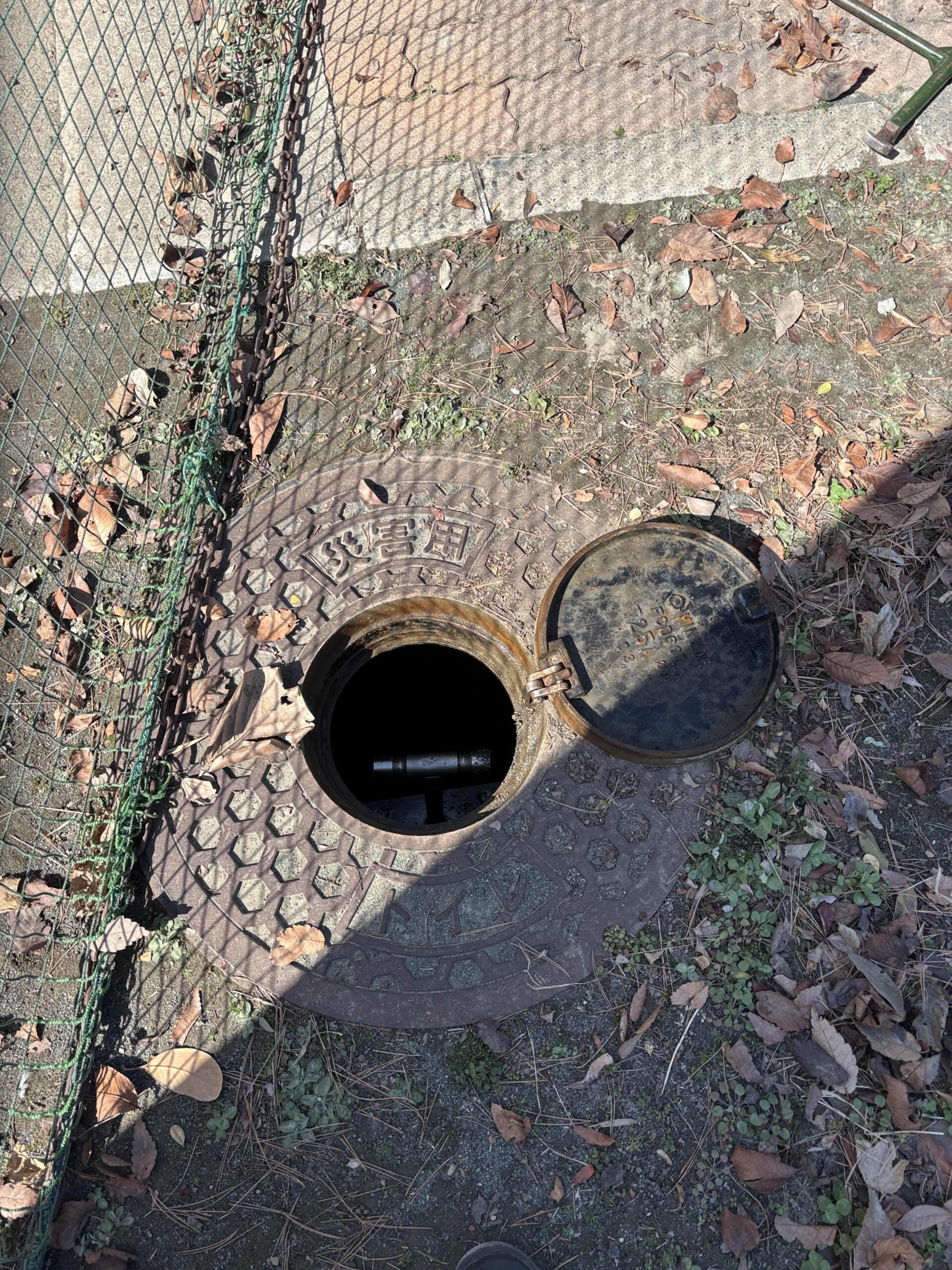 このマンホールの上に、簡易式のトイレを設置して、対応します。災害は発生しないのが一番良いですが、もし発生した時には、みんなで助け合って頑張りましょう。日ごろから、町会はこうした防災面での点検作業を行っています。