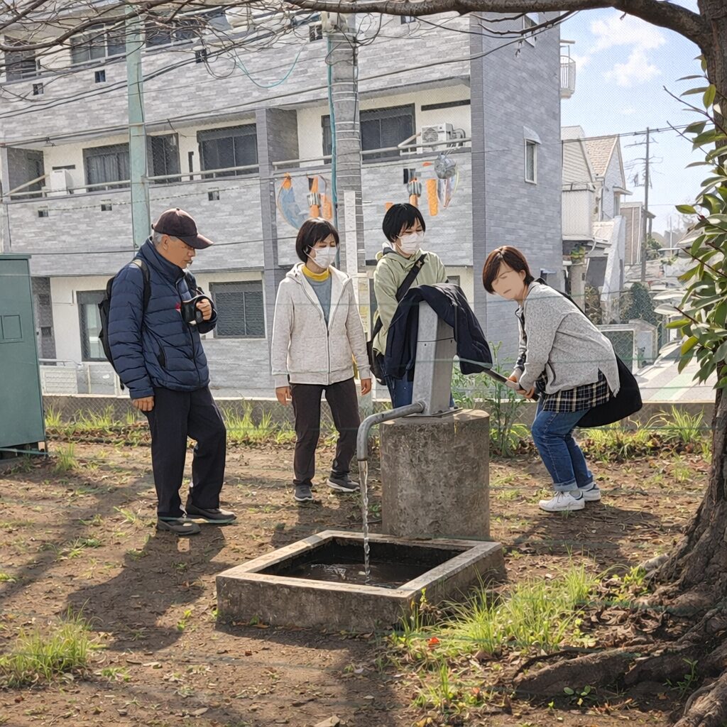 こうしたマンホールトイレの状況を確認するのも、町会の仕事の一つです。いざという時に使えなければ大変なことになるので、年に1~2回は実際にマンホールを開け、井戸水を流して、確認を行います。